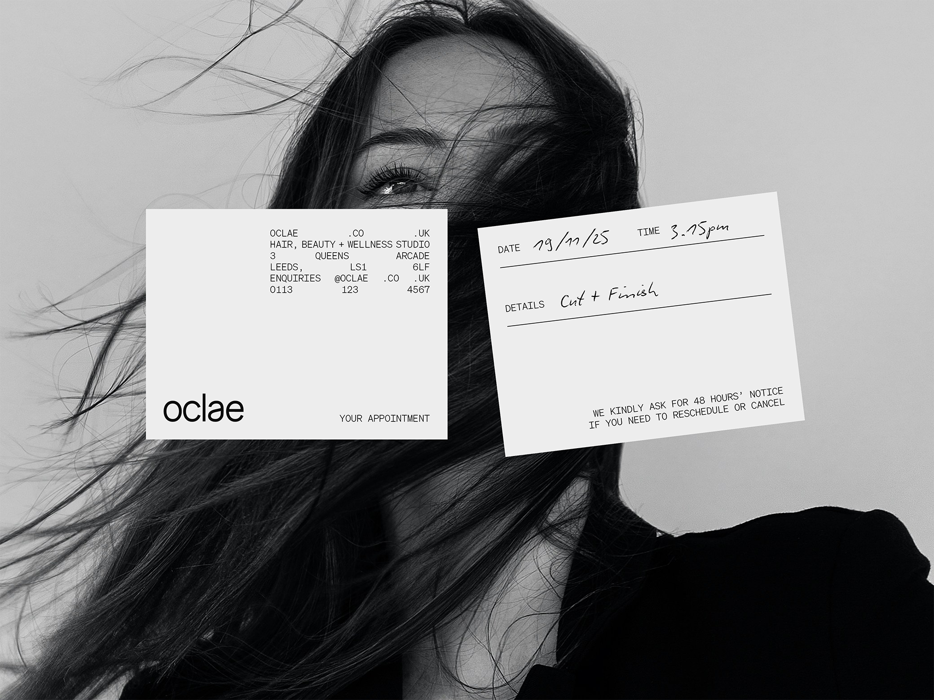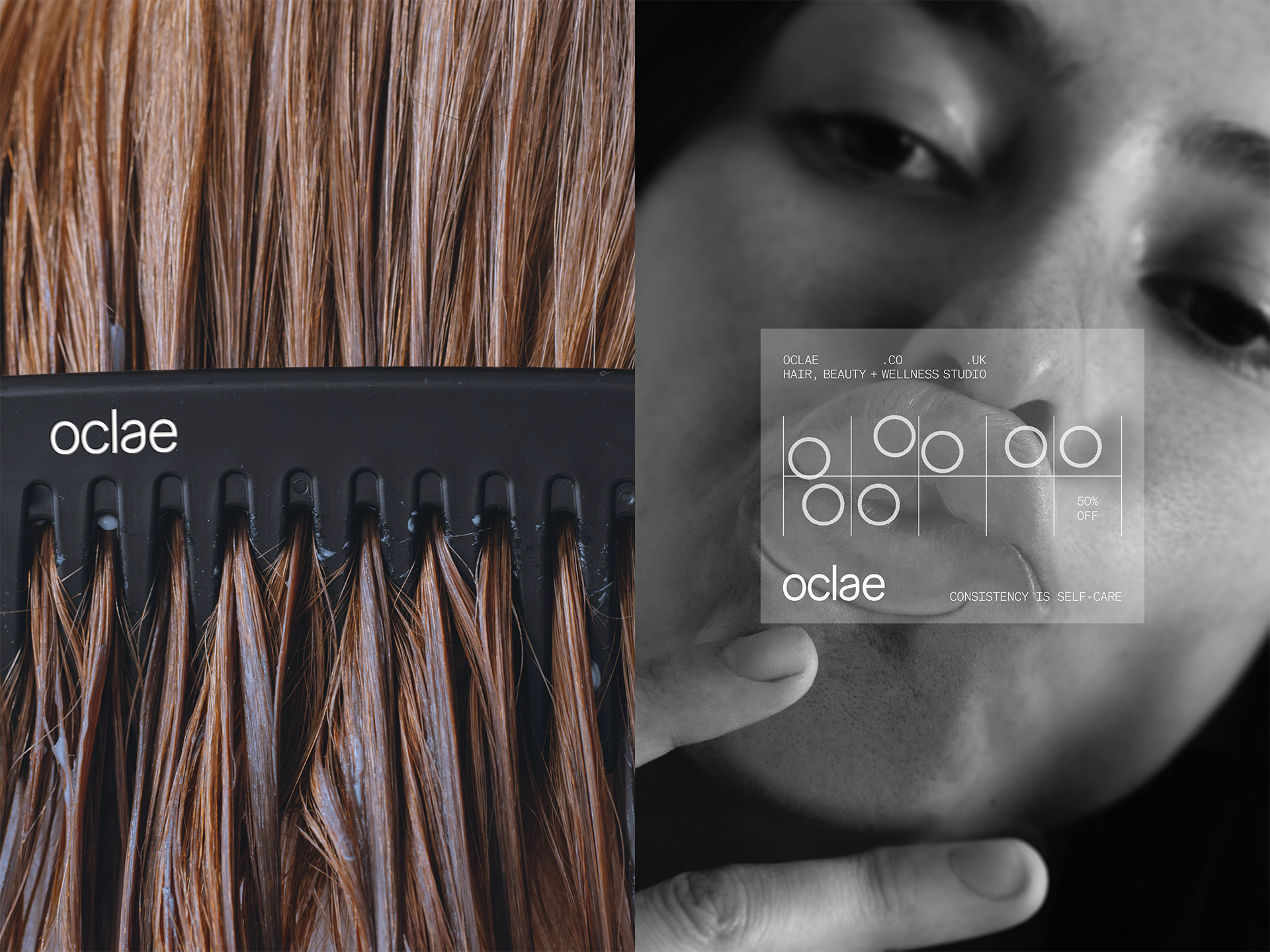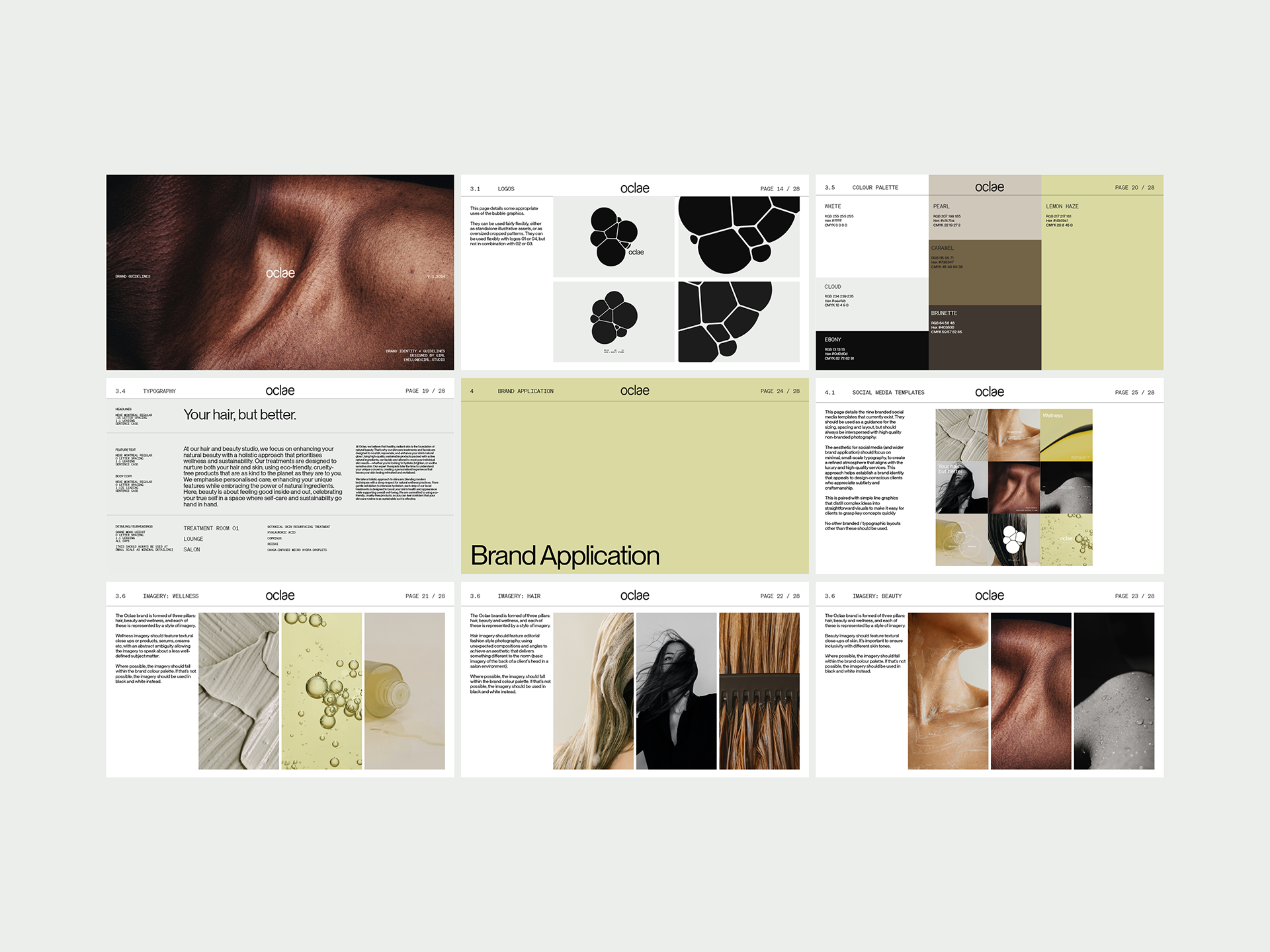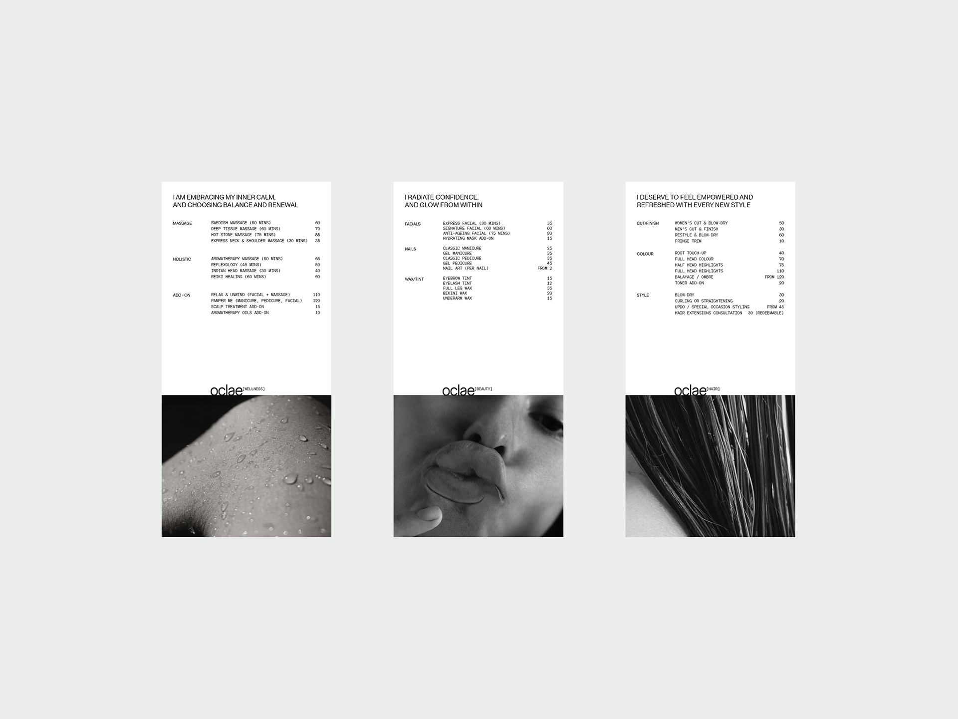 Naming, brand strategy, brand identity, print, packaging, signage and digital design by GIRL. The name “Oclae” was created by us, loosely inspired by the French word éclat, meaning glow. It’s a space where creativity and calm come together, and clients leave feeling restored.